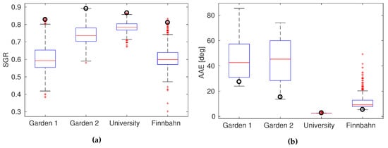 So far, all images were used as a basis for studying the relationship between the SGR criterion and the MinWarping performance. To show the generalization ability of the proposed method, we performed tests based on the principle of cross-validation. Our data are atypical for standard cross-validation, as they are organized in databases that each contain dependent images due to the spatial layout of the databases. We take this dependency of the data into account by performing a group-based cross-validation. This is separated into two experiments: (1) cross-validation of the SGR criterion; (2) cross-validation of the AAE based on the SGR criterion. The results for the SGR criterion are shown in Figure 12a. For this analysis, we split the data into a training and a test set in the following way: one database is retained as test set, and all other databases form the training set. This is repeated in such a way that each database is selected as the test set once. The label of each boxplot denotes the database used as the test set, and the data visualized as the boxplot is the set of SGR values reached by computing the SGR criterion for each parameter combination within this database (sampled as described in Section 3.2). For each test database, the circle marks the SGR value that is reached within this database by using the best parameter combination resulting from the training set. The graph shows that a high SGR criterion in the training set generalizes to a high SGR criterion in the test set. In other words, the selection of the best parameter combination based on the SGR criterion in a training set is an adequate choice for an unfamiliar environment.
