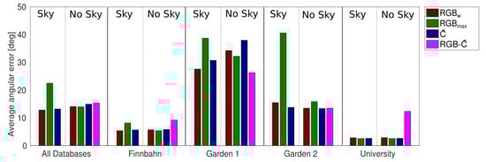 Instead of using manually-created masks, we additionally display the results obtained by using the contrast enhanced channel to compute a sky-ground mask and use this sky-ground mask to blacken the sky in the method (denoted as ). This approach is similar to the one used in [49,50], but differs to the extent that a different thresholding method is used. The results show that this approach improves the overall error compared to the method for the databases, but reaches worse results than the proposed method or . This effect occurs due to errors in the sky-ground separation, which could be identified in multiple images. We did not further investigate this effect, as the blackening of the sky with a correct mask (created manually) showed no improvement compared to the or methods. Therefore, it is not conducive to improve the thresholding, but preferable to use the proposed or channel without thresholding. In Figure 10 and Figure 11, the sampled linear factors closest to the -factors are marked by a cross. This explains the good homing performance of the -channel, as the -factors produce a high SGR value; however, other factors reach even higher values.