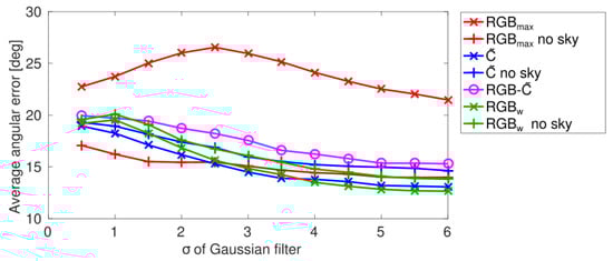 Effect of the parameter used for Gaussian filtering on MinWarping performance. The results in average angular errors are averaged over all databases.