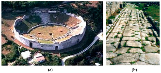 The prosed scenario at Casinum amphitheater: (a) an overall view; (b) a zoom view of the paved road.