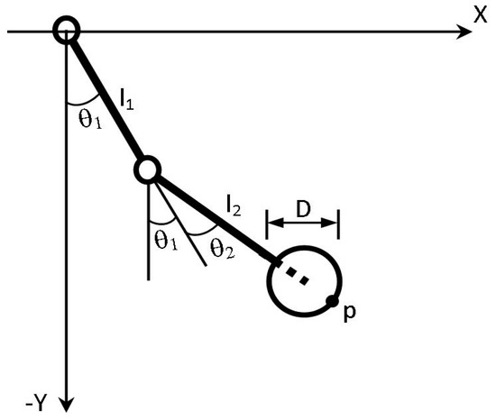 where θ is the joint variable vector and τ is the vector of generalized forces acting on the robot manipulator. M(θ) is the inertia matrix, are the Coriolis/centripetal forces, and G(θ) is the gravity vector. In Equation (8) we are not taking into account the friction torques since we consider them as negligible. The dynamic model of the two-link planar arm can be written by substituting the following data in Equation (8)