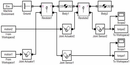 The dynamic model for transfer phase was also implemented in SimMechanics environment, as aid for the leg sizes synthesis process and also in order to estimate the needed actuator torques. Figure 6 shows the SimMechanics model that can find the torques τ1 and τ2 required to obtain a prescribed movement of robotics leg as referring to the model and formalism in the scheme of Figure 6, further details on simulation symbolism and operation can be found, for example, in [32].