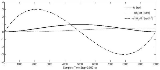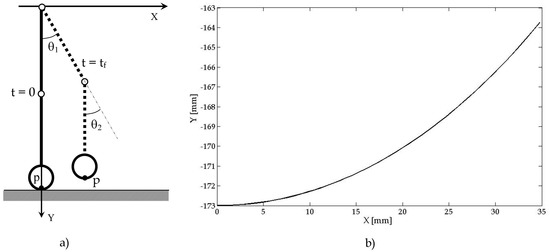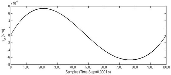 Figure 7 shows an example of trajectory that has been tested. The end-point p is moved from the initial to the goal position, along a trajectory with a predefined path. Figure 8 and Figure 9 show, for example, the workspace variables in terms of angular displacements, velocities, and accelerations that have been considered as joint inputs for the simulation. A fifth degree polynomial has been chosen for the angular rotations interpolation. At the beginning as well as at the end point of the movement, the velocity and acceleration of point p has been set equal to zero. Figure 10 and Figure 11 show time diagrams of torques τ1 and τ2 that have been obtained by solving the proposed model in Equations (8)–(16) for the specific trajectory that is shown in Figure 9.