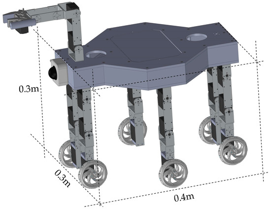 The low-cost design of the leg architecture has been obtained by using a mechanical solution with few components made with aluminum and by selecting as much as possible commercial components. The proposed leg measures 160 mm in length, 45 mm in width, and 20 mm in depth. The total weight is about 2.5 N. It has been chosen to use Mecanum-wheels with a 60 mm diameter. Mecanum-wheels are wheels with small discs around the circumference which are inclined 45 degrees to the rolling direction. The effect is that the wheel can roll, but can also slide laterally. The proposed solution has been adopted in order to allow the changing of direction strategy in wheeled operation. SolidWorks environment has been used for carrying out simulations of the proposed design solution due to its convenient features in structure analysis and in the operation study of multi-body systems. Simulations have been carried out investigating basic robot performances in a virtual environment in order to check the design feasibility before prototyping. The overall robot configuration is presented in Figure 12. The hexapod can fit into a cube of 0.4 × 0.3 × 0.2 m. Total weight of the robot is about 30 N.
