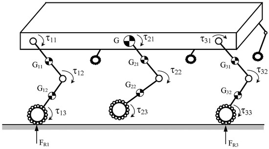 The Lagrange formulation can also be used to define a dynamic model of the overall robotic system, as proposed in [36,37]. The total kinetic energy is given by the sum of the kinetic energy of the main body TB, legs Tli and wheels Twi