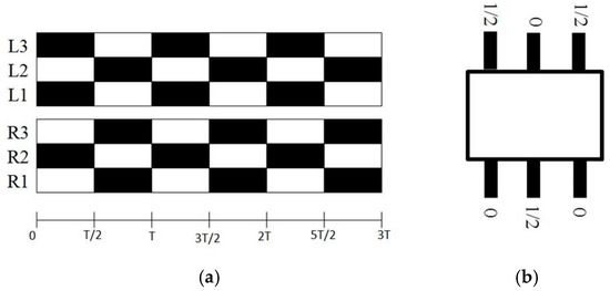 Walking strategy (a) footfall formula for tripod gait (black color indicates the contact of a leg with the ground; L1, L2, L3 stands for left legs 1, 2, and 3, respectively; R1, R2, R3 stands for right legs 1, 2, and 3, respectively) (b) legs phase relations.