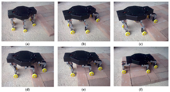 Main frames of step climbing strategy: (a) approach to a vertical step; (b) forward legs negotiating the step; (c) middle legs approaching the step; (d) middle legs climbing the step; (e) rear legs approaching the step; (f) hexapod completes the step.