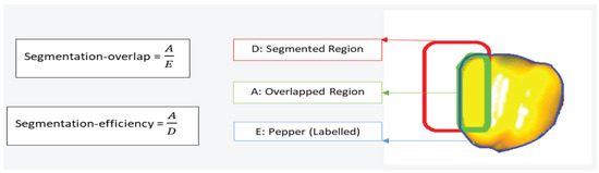 The highest segmentation quality is achieved where both segmentation-overlap and segmentation-efficiency are 1, meaning segmented and labeled regions overlapped completely. High segmentation-overlap and low segmentation efficiency means that the segmented region covers a large part of the pepper, while only a small part of the segmented region contains parts of the pepper. Low segmentation-overlap and high segmentation-efficiency means that that the segmented region covers only a small part of the pepper, while a large part of the segmented region contains parts of the pepper.