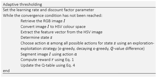 The pseudo-code of the method is presented in Figure 3. In this approach, for each input image, initially hue and saturation features are extracted to find the state of the image. Then, an action (threshold) is selected and applied to the image to segment it. The process followed by comparing the segmented image with the ground truth (labeled image) to measure the segmentation quality. The quality measure q (Equation (1)) is used as a reward function to update the Q-table using Equation (4). The whole process continues until it reaches the convergence condition (Equation (8)). The structure of the proposed approach is also illustrated in Figure 4.