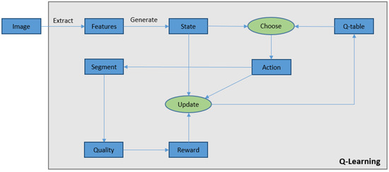 Illustration of the proposed algorithm for image segmentation using Q-learning. For each image the state is determined and an action is selected to segment the image. Then the segmentation quality function is used to compare the segmented image with the ground truth to compute the reward and update the Q-table.