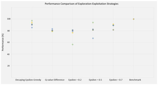 Decaying -greedy strategy enhanced the performance to 91.5% of the benchmark, with 73% fewer iterations. This algorithm improved the performance by 11.2 p.p in comparison to the QM strategy, with similar number of iterations. It had slightly better performance than the -greedy strategy ( = 0.7) while requiring 46% fewer iterations.