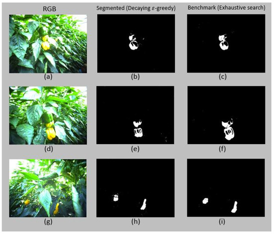 In this work a dataset with 170 labeled images of peppers in a greenhouse environment was used. The images were split into training and testing sets using 5-fold cross validation. For each image in the training phase, we first extract features to determine state of the image (see Section 3.2.1). Then, the agent using an exploration-exploitation strategy selects an action (threshold) and segments the image. The process continues by comparing the segmented image with the ground truth to compute the reward value (see Section 2.1). Afterward, the Q-table is updated using Equation (4), and the agent checks if the convergence condition is met. Images in the training set are repeatedly fed into the system until the convergence condition is met. At each time step in the training phase the action with the highest Q-value for each state can be found, called greedy action [34].