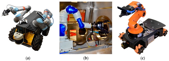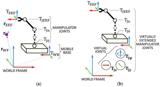 The Equation (1) describes the manipulator’s serial kinematic chain. The joint states are represented by (Equation (2)). Figure 8b depicts the joint representations with additional virtual joints , and that describe the mobile base’s DoF. and constrain the base to the xy-plane and allows the base to rotate around z-axis. The kinematic chain can now be described by Equation (3) with the extended state vector (Equation (4)).
