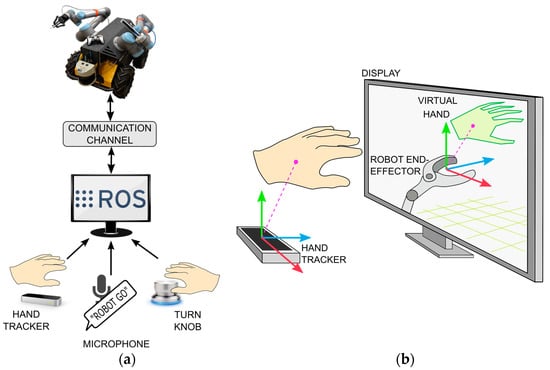 Humans naturally use hand gestures and speech for conveying instructions and feedback to one another. Thus, it is intuitive to use hand gestures and speech when commanding remote systems [17]. Telerobotic hand tracking applications have demonstrated the benefits of gesture-based control for platform or robot end-effector (EEF) guidance tasks [18,19,20,21]. Controlling spatial manipulators with conventional controls is not intuitive as the operator must construct a complex mental model relating the control input, via joystick or mouse to 3D task space (i.e., context switching). A study on telerobotic surgery indicates that touch-free interfaces have a faster learning rate than touch-based interfaces supporting the potential for better performance with touch-free interfaces [22]. Speech input is considered a viable substitute for conventional controls (e.g., keyboard, mouse, joystick) [23]. Also, a single verbal phrase (i.e., “open the door”) can combine multiple complex instructions thus reducing operator fatigue. In [24], operators utilized both gestures and speech to manually control a simulated aerial vehicle and concurrently performed data entry using manual or voice commands resulting in a 40% decrease in data entry time.