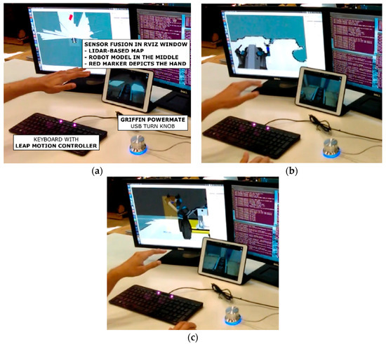 TeMoto has been successfully tested on the robot platforms shown in Figure 1. For hand tracking we use a Leap Motion Controller (LMC) [40], a depth sensing camera, which—in our set-up—is embedded in the computer’s keyboard. LMC provides low-latency tracking and does not require markers attached to the operator’s hands. LMC is able to track all the joints of a hand, from which TeMoto utilizes the palm’s position and orientation to create a simplified virtual representation of the arm. A Griffin PowerMate infinite turn knob allows the operator to change the scaling factor intuitively (i.e., logarithmically).