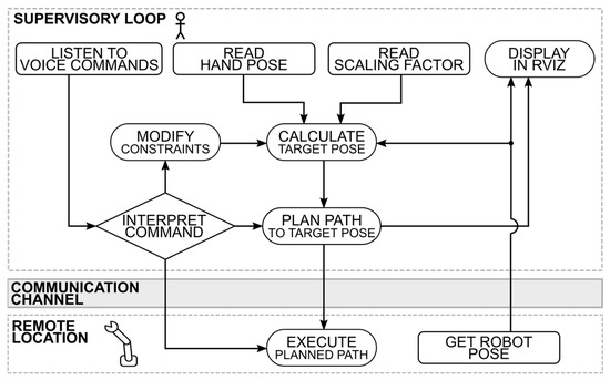 When possible, TeMoto leverages ROS packages to minimize the redevelopment of existing capabilities. MoveIt! [41] (which internally utilizes RViz [39] and the Open Motion Planning Library (OMPL) [42]) provides the robot’s kinematics, motion planning and 3D visualization. ROS Navigation [43] generates collision-free paths for the mobile base. Voice commands are converted to text using a speech recognition package Pocketsphinx [44]. The TeMoto Core contains 5 developed modules, implemented as ROS nodes. Instruction parser acts as a filter that detects valid voice commands. Manipulator Interface and Base Interface provide means for manipulation and mobile navigation respectively. The Human-Robot Interface (HRI) agent directs teleoperation system based on operator input and feedback data. It is also responsible for keeping track of the system’s overall status. The HRI agent is structured as a supervisory controller (Figure 5), which continuously monitors command inputs (hand pose, scaling factor and voice commands). Visualization Manager processes all operator graphical guidance and constraint related data for visualizing in RViz. The hand pose, robot pose and surrounding environment are visually combined after adjusting for current scale.
