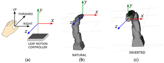 (a) Operator’s perception and the coordinate system for LMC. Two control perspectives for the robot end-effector: (b) natural and (c) inverted.