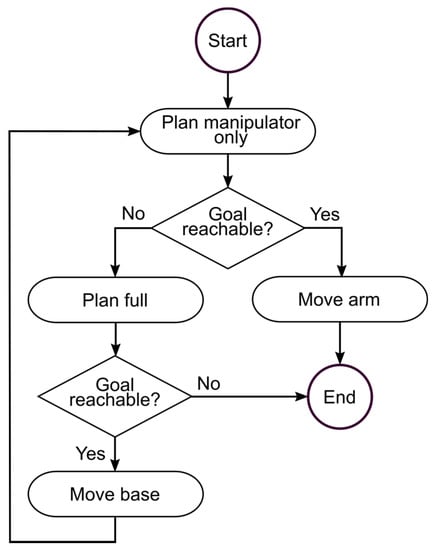 Figure 7 illustrates the integrated MM planner. Upon receiving a EEF target pose, a plan is generated considering only the manipulator (Figure 8a). If the target pose is reachable then the plan is executed. If the target is not reachable, then a new plan is generated using the manipulator’s Extended Kinematic Description (EKD) (Figure 8b). If a successful collision-free plan is found, the end location and rotation of the mobile base are extracted and automatically passed to the navigation planner. Once the mobile platform has reached the target, the process is repeated until the target EEF pose is attained. The algorithm ensures that the EEF reaches the target pose given a single operator command and recovers from positional uncertainty (e.g., dynamic obstacles) between the intended and achieved poses for the mobile base.