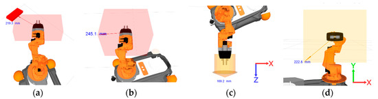 Each constraint is visualized as a virtual fixture informing the operator of the constraint. By default, when no constraints are applied, a rectangular parallelepiped is rendered together with a red arrow and a translucent 3D bounding box for depth perception (Figure 10a). The red parallelepiped serves as a virtual marker representing hand pose (the parallelepiped is aligned with the centroid of operator’s palm) while the arrow depicts in-scale displacement between the EEF and gesturally designated pose. When the orientation is maintained (Figure 10b), the red parallelepiped is not rendered into the MR scene. When movements are constrained to 2D space, the virtual markers are represented in yellow (Figure 10c,d). A distance numerical marker, indicating the distance between the center points of the EEF and virtual hand, is often added to MR scene to provide a scale feedback. Furthermore, trajectories can be temporally visualized prior to execution in the MR scene.