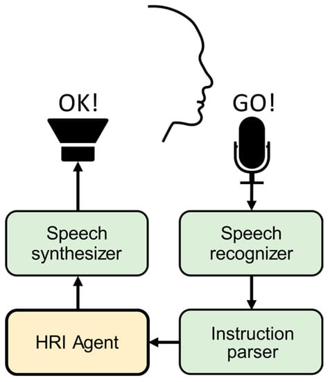 Verbal interaction allows the operator to focus on the visual feedback, rather than manipulating a controller mapped to the robot’s task space. The structure of a verbal instruction follows the command language approach. Each instruction is predefined and paired with a callback procedure triggered when a matching word sequence is detected. The instruction set is greater than the number of callback procedures to provide flexibility without creating command ambiguity. For example, both “robot, please move” and “robot, please execute” map to a procedure where the system executes a motion task. Figure 12 gives an overview of the verbal interaction cycle. The speech recognition module converts audio commands to text. The text stream is sent to the instruction parser to identify known word sequences. Valid instructions are sent to the HRI agent triggering a callback procedure. Finally, audio feedback is synthesized using sound-play package [47] to communicate task status to the user.