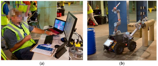 From the perspective of safe and reliable task execution, it is critical that the operator is fully aware of the state of the robot in its environment. Also, the data necessary for the operator to make this determination must be suitably presented. Many telerobotic systems suffer due to overly complex operator interfaces. For this effort, we distinguish between the complexity of the interface (to be avoided) and the complexity of the task/environment (to be shared). Tracking sensor data from multiple sources (e.g., displays) dramatically increases the operator’s cognitive load and chances for error. A number of studies emphasize the importance of choosing what and how to represent data from multiple sensors [14,25,26]. The MR scene combines data from a variety of sources providing the user a clean and intuitive visual interface while maintaining high situational awareness. Figure 11 compares the operator’s perspective over MR scene (Figure 11b) and a photo of the actual environment with the robot platform (Figure 11a). The sensor-fused mixed-reality workspace (Figure 11b) visualizes different types of data, including: