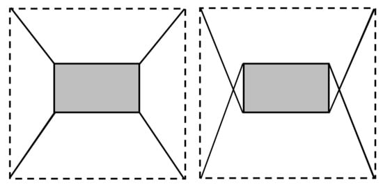 The first investigation concerns the group of cable robots shown in Figure 2 which comprises two redundant, planar and fully constrained cable robots with three dofs. The topology of the two robots analysed is identical but the points where cables are attached to the moving platform are different. Therefore, it is said that the cable layouts are different. As shown in Figure 2, the moving platform of the robots is rectangular () and is driven by four cables attached to the four platform vertices. The cable output points are located at the four vertices of a square. The coordinates (x, y) of the cable output points, expressed in a reference frame located at the square centroid, are: , , and . It is assumed that the platform moves in a horizontal plane (plane xy) and that the overall design of the platform the drive pulleys and the winches allow avoiding cable interference in the robot with crossed cables (Figure 2, on the right). For both the robots, the WEC can be computed by employing the formulations proposed in Equations (4) and (5), since both the robots are redundant and the platform can be fully constrained. In this example, it has been chosen to impose null wrench components () in the directions orthogonal to the one along which a force or torque is maximized. Additionally, since no external wrench is assumed to be applied on the platform, is a null vector too.