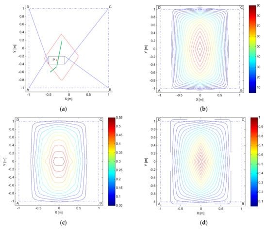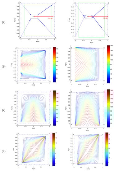 and , with the obvious meaning for symbols, have been computed similarly, always starting from the general formulation in Equation (7). Figure 3 collects all the results achieved. In Figure 3a, the sketches of the two cable robots can be recognized: dash-dotted lines are employed to connect the four cable output points; cables are represented by blue lines and the moving platform is depicted in solid black line. A green quadrangle delimits the Static Equilibrium Workspace (SEW) defined as the set of poses of the moving platform for which static equilibrium can be obtained while maintaining positive tensions in all the cables. The SEW has been computed with the shown orientation of the platform, that is, with the sides parallel to the x and y axes. As an example, the has been evaluated at point and refers to the force exertion capability along the positive direction of axis x (see the red arrows and the red numbers). As far as the range of tensions that can be resisted by the cables is concerned, without loss of generality, the maximum value has been set to while the minimum to . The arrows in bold line overlapped to the cables provide a scale representation of the cable forces which allow achieving the maximum force represented by the red arrow, whose module is the value, in , computed at point , which is also written below the red arrow.