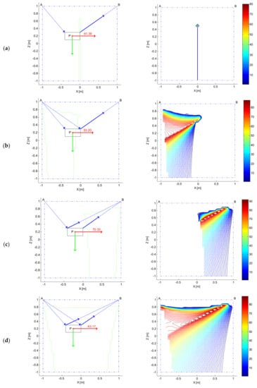 The SFWs of all the robots, computed keeping the platform horizontal, are represented in the subplots on the left of Figure 6, for clarity, delimited by green solid lines. The SFWs have been geometrically bounded by the square box with vertices at and . The isolines in the plots highlight the greatly different behaviors of the four cable driven robots: while for the underactuated robot (subplot (a)) it is possible to find a solution to the problem stated in Equation (9) in just one point of the SFW, by increasing the number of active cables, the force exertion capabilities improve considerably. The subplots (b) and (c) prove that, for the given problem of maximizing a rightward force, the two fully actuated robots behave very differently in their SFWs. The SFWs of the robots are very different (basically symmetrical about the z axis) and not overlapped, which complicates performing a straightforward comparison between the robots. Nonetheless, the plots provide clear hints about the regions where these robots can best perform. Clearly, the most effective cable layout could be identified once the geometrical features of the tasks to be executed and of the workcell were known: in general, the cable arrangement of Figure 6b seems preferable since the takes high values in a wider region of the workspace. Finally, in Figure 6d, the of the redundant robot is plotted. Obviously, the availability of a fourth cable allows extending the SFW and improving the performances within it. In particular, the rightward force exertion capability shows that this robot merges the benefits of the fully actuated robots discussed earlier, at the expense of an increased cost, design complexity and cable obstruction in the workspace.