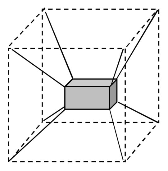 The third investigation concerns the cable robot shown in Figure 7 which is a spatial redundant cable robot with six degrees of freedom. The robot design and cable layout recall those of several prototypes developed worldwide [,]. The moving platform of the robot is a parallelepiped () that weighs and is driven by eight cables attached to the eight platform vertices. The cable output points are located at the eight vertices of a cube. The coordinates (x, y, z) of the cable output points, expressed in a reference frame located at the cube centroid, are: , , , , , , and .