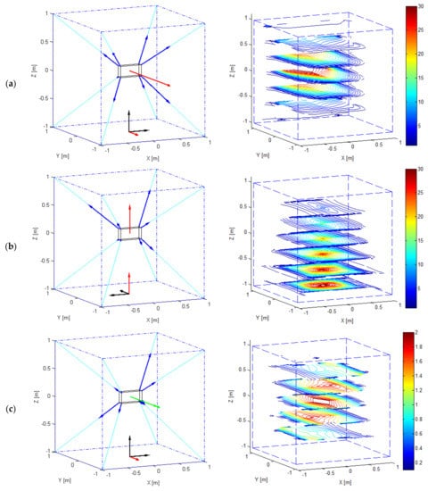 Figure 8 collects the results achieved. For the sake of clarity, in the left subplots of Figure 8, the origin of the rotated reference frame is set at point (0 m, 0 m, −1 m) and the direction is highlighted by means of a red arrow. The results shown in the subplots on the left of Figure 8 refer to a single point . Dash-dotted lines are employed to connect the eight cable output points and hence to represent the robot typical workspace; cables are represented by light-blue lines and the moving platform is depicted in solid black line. As an example, the has been evaluated at point . As far as the range of tensions that can be resisted by the cables is concerned, without loss of generality, the maximum value has been set to while the minimum to . The arrows in bold blue line overlapped to the cables provide a scale representation of the cable forces which allow achieving the maximum force/torque represented by the red (in case of forces) or green (in case of torque) arrows. In the subplots on the right, each analysis is extended to the whole SEW: only the results achieved in some representative horizontal planes of the SEW are represented for clarity. As usual, in these subplots WEC values are represented by isolines, the red ones identifying the regions where the best performances are achieved (i.e., where the highest WEC values are achieved). Figure 8a shows the values (in ), taken by the , while Figure 8b shows the (). Finally, Figure 8c addresses the torque exertion capabilities of the robot by showing the (Nm).