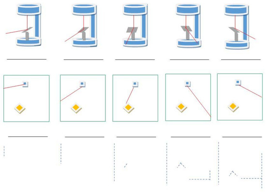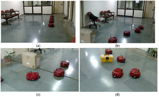 Here, the robots were asked to go from a pre-specified source to a pre-specified goal in a chain structure. As the slave robots’ sensors also detect the object ahead of them, i.e., their respective master robots, it has to be made sure that they do not perceive them as obstacles. The method by which this is done is that the master robot exerts a higher attraction force than the object ahead exerts the repulsive force. This results in resultant attraction toward the master robot. The images from the actuation can be seen in Figure 8. The results are also supplied as Video 1.