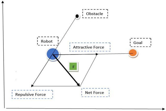 The repulsive force is inversely proportional to the distance between the robot and the obstacle. Moreover, the force only comes into the picture whenever the robot moves into the vicinity of the obstacle (i.e., the distance between the robot and the obstacle is less than or equal to ). As the robot moves near the obstacle, the repulsive force increases thus it tries to deflect away from the obstacle more strongly. The combination of attractive and repulsive forces is responsible for the motion of the robot. Figure 3 demonstrates this.