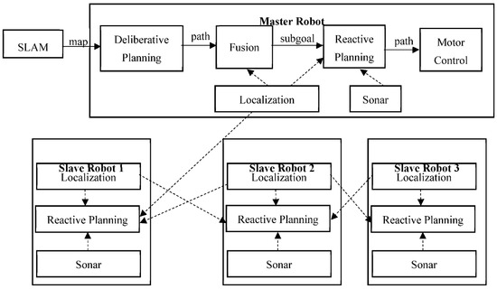 The overall methodology of the approach is shown in Figure 4. The approach needs a map that is produced by using SLAM in the absence of any dynamic obstacles. Thereafter, the master robot plans its path from source to goal. First, a deliberative path is computed, which acts as a guide for reactive control. The technique is used for the navigation of multiple robots forming a chaining behaviour. The details of all modules are presented in the following sub-sections.