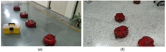 Figure 8a shows the robots before they have started the motion. As seen from the figure, the robots are placed in chain-like fashion initially, so that each robot except the last robot has one slave robot, and each robot except the first robot has a master robot. The motion of the robot when it has not yet encountered any obstacle is shown in Figure 8b. As seen above, the robots follow each other in a perfect chain-like fashion. Figure 8c shows the robots avoiding the obstacle. The robots intelligently avoid the obstacle placed in the way while maintaining the chain-like formation among themselves. Figure 8d shows the robots successfully avoiding yet another obstacle that has been dynamically placed. The robots in Figure 8d do not depict a chain formation. However, in Figure 8e, it can be seen that the robots have gained the expected chain formation back. Figure 8f shows the robots reaching the goal. The final position of the master robot is same as the goal marked in the map while finding the path using A* algorithm. However, the slave robots have their final position slightly away from it so as to avoid collision. These points are not predetermined and are solely fixed based on the potential field generated by the robots themselves. This results in a dynamic equilibrium among the slave robots.