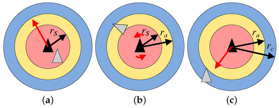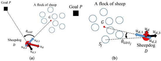 Next, the unit vector from the sheepdog to the center of the flock of sheep under present conditions (Figure 10b) is , and the unit vector from the sheepdog to the ith sheep is . Similar to Formula (17), if the angle formed by and is , the following formula is established.