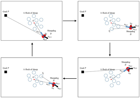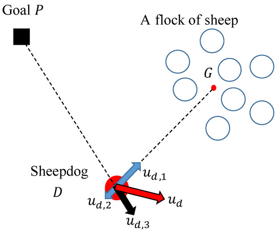 Prior research on sheepdog systems was firstly conducted by modeling the sheep and the sheepdogs and reproducing the guiding behavior of the sheepdog [8]. Other research has proposed and verified many sheep and sheepdog models from the perspectives of degree of similarity to behavior of an actual sheepdog system, and guidance performance in guiding a flock of sheep [9,10,11,12,13,14]. In [10], the sheep were modeled in relatively high detail. In [11,12], guidance was proposed by having a sheepdog move to the left and right behind the sheep to prevent them from scattering. In [13], a method for preventing a flock of sheep from being split up (by implementing an action to bring the sheep together when they have scattered) was proposed. Lastly, in [14], a comparative verification of multiple control methods for sheepdogs was performed.