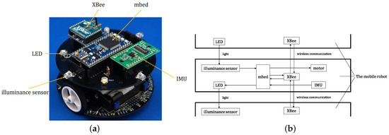 Developed robot system. (a) Overview of the mobile robot; (b) The block diagram of the mobile robots.