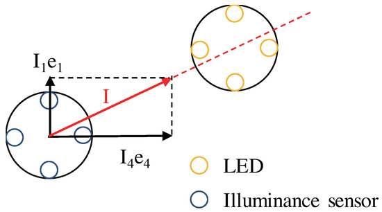 Figure 3b shows a block wiring diagram for the robots. Each robot is equipped with four LED and four illuminance sensors to estimate relative position according to the intensity of the light emitted by the other robots. As shown in Figure 4, the illuminance sensors are installed so they are directed outwards at 90[deg] from the robot and from one another. The estimating robot obtains sensor value excluding offset from the four illuminance sensors. The vector is synthesized from the values obtained to calculate . Specifically, as shown by formula (15), the direction is the unit vector in the direction of each illuminance sensor, and its scale sums up the vectors of . The value of I that is calculated, as shown in formula (16), is calculated such that the position of the robot that is estimated is at a distance inversely proportional to in the direction of I. For example, in Figure 4, it is , and the direction of the robot is judged to be .