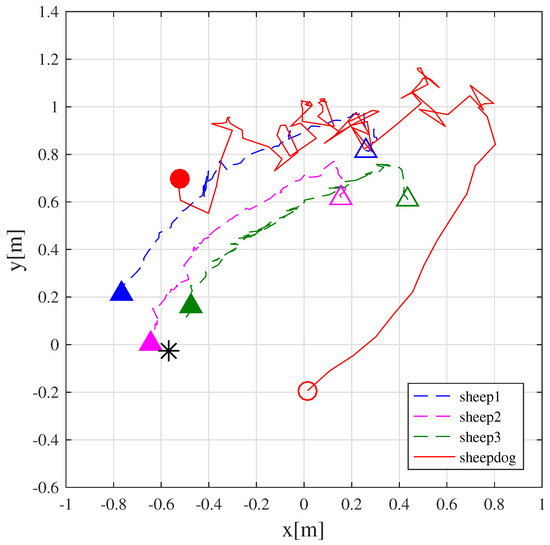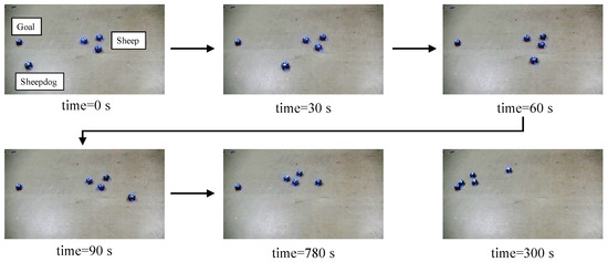 The actual experiment was done using three sheep robots, one dog robot, and one goal. Each of the robots is identified by an integer from 1 to 5 (1: sheepdog, 2–4: sheep, 5: goal) and emits the light in numerical order. If both the sheep robots and dog robot could not obtain light from another robot, it is assumed that they did not receive force from that robot. Figure 5 shows photographs taken during the experiment. Figure 6 shows positional data for the robots, obtained by motion capture at the start and at the end of the experiment, and Figure 7 shows the tracks of the robots during the experiment. In Figure 7, the position of the dog robot is shown by the circle symbol, that of the sheep robots by the triangle symbol, and that of the goal by the asterisk symbol. Figure 5, Figure 6 and Figure 7 confirm that the sheepdog was able to guide the flock of sheep to the goal. When guiding three sheep, the impact of blind zones (cases where a certain robot cannot obtain the light of another robot) during measurement of relative positions by light was small, so guidance could be achieved by ignoring this robot, but as the number of sheep robots increased, cases where the goal is invisible occurred with increasing frequency, leading us to conclude that their impact becomes impossible to ignore.