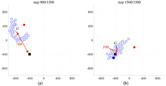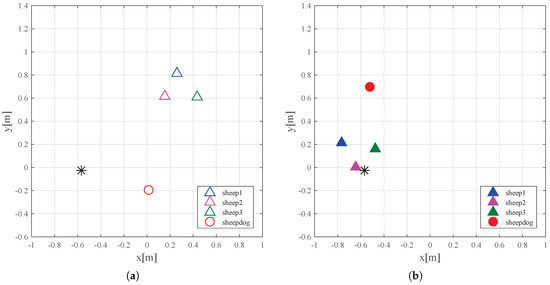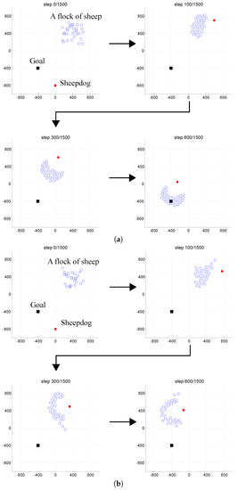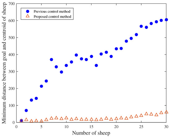 Next, as the number of sheep is varied from 1 to 50, the guidance performance under the increase of the effect of blind zones was analyzed. The experiment was done 50 times for each flock size of sheep. The results are shown in Figure 13. The number of sheep is represented on the horizontal axis, and the average guided distance when the test was performed 50 times is represented on the vertical axis. Figure 13 reveals that using the previous method, as the size of the flock increases, the guided distance also increases. With the proposed method on the other hand, the guided distance does not change very much, revealing that stable guidance is possible as the number of sheep increases. It shows that when there are 30 sheep, using the previous method, the guided distance is about 600, but using the proposed method, it is about 50. Figure 14 visually represents the guided distances. When the situation where the guided distance is 700 (Figure 14a) and the situation where the guided distance is 100 (Figure 14b) are compared, it is confirmed that there is a great difference in the guidance performance of the previous method and the proposed method.