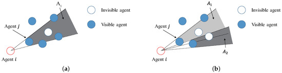 Definition of the blind zone due to the agents’ size. (a) Illustration of the blind zone made by the nearest agent; (b) Integration of each blind zone.