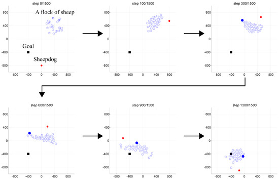 Snapshots of the sheep and the sheepdog position based on the proposed control method.