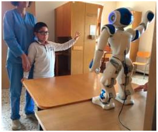 Example of the child–robot interaction during the therapeutic session (the child is imitating the robot moving his arm). A professional educator was always present nearby to support the child.
