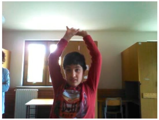 A frame extracted from one of the videos recorded by the robot (the child is imitating the robot raising his arms up).