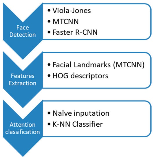 The MTCNN is a deep learning neural network architecture that employs multi-task cascaded CNNs, which are the state-of-the-art for many computer vision applications []. The three main characteristics of the MTCNN for performance improvement are: (i) the cascaded CNNs architecture; (ii) an online hard sample mining strategy; and (iii) joint face alignment learning. The last characteristic is of particular interest because facial landmarks could be used to estimate the head pose and, thus, the attention. The MTCNN can outperform state-of-the-art methods across several benchmarks while achieving real-time performance for 640 × 480 VGA images []. These are both interesting features for the application being investigated and, therefore, it has been selected for this study’s experimental testing.