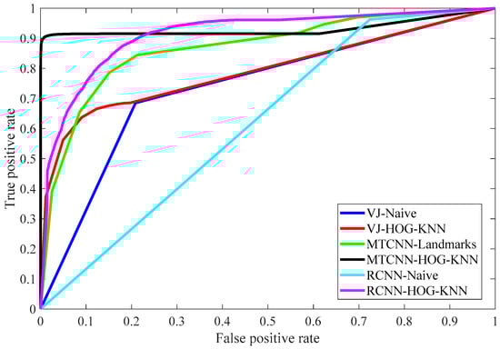The Viola–Jones is a widely used method for object detection, in particular, face detection which was the first application demonstrated in the seminal paper []. The reasons for its success are the real-time computation and its robustness (very high true-positive and very low false-positive rates). It has been used as part of the procedure for the recognition of visual focus of attention and its level in human–robot interaction [].