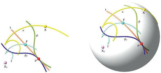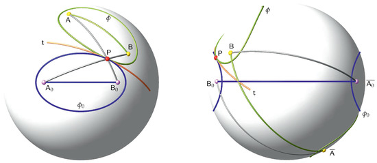 Figure 4. As on the sphere points can be replaced by their antipodes, it can easily be seen that every spherical conic can be interpreted as a spherical ellipse (e.g., [35] (Section 10.1)). The left and the right figure show the same symmetric rolling motion. If we replace and by their antipodal points and , respectively, and look on the sphere from the right side, then we get the figure illustrated on the right-hand side.