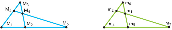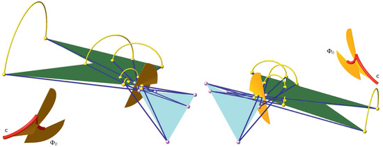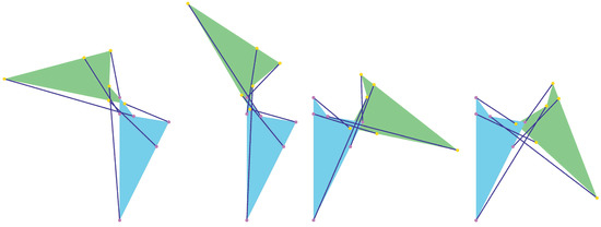 In [38], Duporcq describes the following remarkable motion: Let and be the vertices of two complete quadrilaterals, which are congruent. Moreover, the vertices are labeled in a way that is the opposite vertex of for (cf. Figure 7). Then, there exists a 2-parametric line-symmetric motion where each is running on spheres centered in .