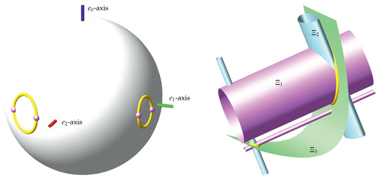 For the example at hand, the fixed axode can be described in the dual representation (If is the equation of the plane of symmetry, then its dual representation is given by the homogenous quadruplet according to [11] (Section 6.2)) as the intersection of the following three surfaces displayed in Figure 8, right: