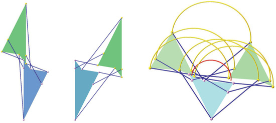 - : Under this assumption, we can solve the condition implied by Equation (10) for , which yields:It can easily be checked that the obtained solution corresponds to the hexapod’s platform and base illustrated in Figure 7, which are also known as Duporcq’s complete quadrilaterals [38]. In the remainder of the paper, this interesting solution, which is discussed/studied in more detail in the next section, is called Duporcq hexapod. Based on this notation, we can formulate the following theorem.